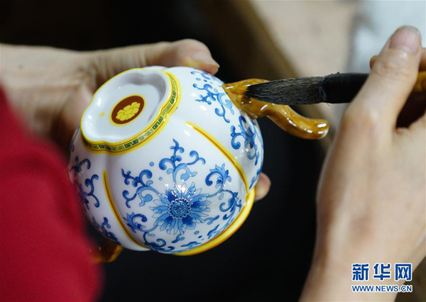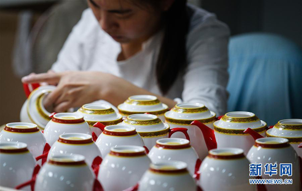9月26日,在位于江苏南京的高淳陶瓷生产车间,工人在对瓷器进行手工描金。