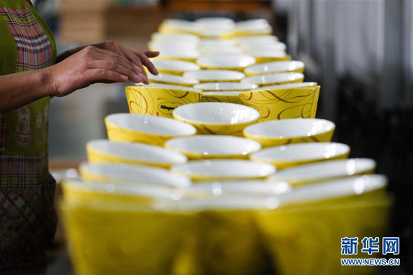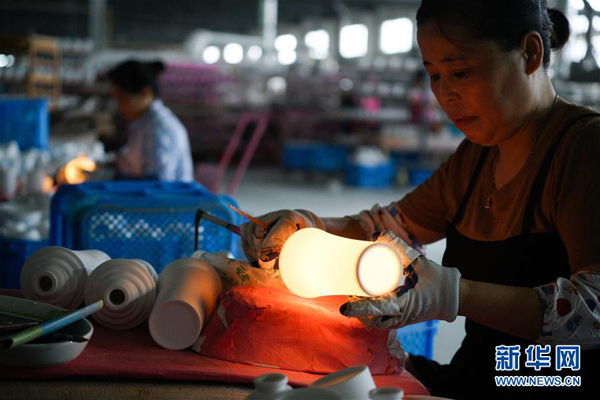 9月26日,在位于江苏南京的高淳陶瓷生产车间,工人对瓷器半成品进行手工贴花。
