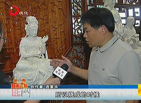 镜头前这尊精美的白瓷雕塑就是获得一等奖的作品《仿宋木雕观音》,是陶瓷艺术大师连紫华在2014年几经周折才创作而成的,取材于一尊宋代木雕观音。