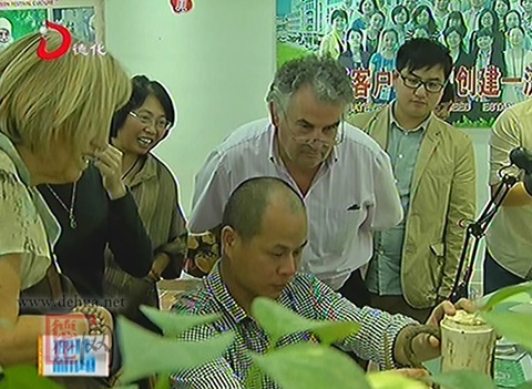 【同期声 英国威尔士大学校长休斯:我非常高兴能够到这儿来,然后看到这么多的作品,我知道德化的(陶瓷)文化源远流长,有千年的历史,就是我们来这儿学习的话,印象非常深刻,希望将来能够(合作),我们大学能够跟这边合作,能够把东西方的文化,能够通过两个大学的交流,把两个民族的文化促进带动起来。】