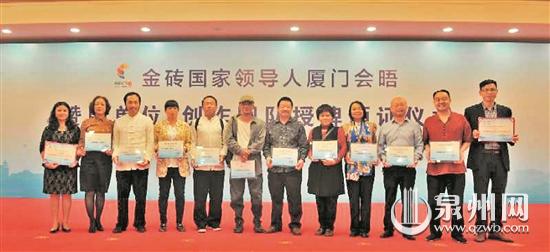 早报讯 (通讯员王双季 记者陈小芬 文/图)日前,金砖国家领导人厦门会晤赞助单位、创作团队授牌颁证仪式在厦门举行。在此次会晤中,金砖国礼入选12支团队,德化占了10支,16件国礼,德化占15件。另外德化入围35件作品。其中,德化的陈仁海设计团队获颁“厦门会晤礼品研制突出贡献奖”,德化的柯宏荣、陈桂玉等9个金砖国礼团队获得金砖礼品研制贡献奖。
