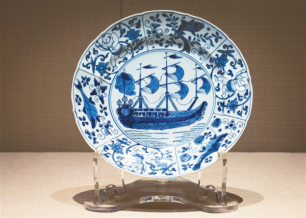此次展出的清乾隆青花帆船图花口盘就是外销瓷中的精品。该盘既有“连生贵子”的中式纹样,又有“中西结合”的三桅帆船,不仅具有极高的艺术价值,而且真实地反映古代航海和瓷器贸易历史,有珍贵的史料价值。