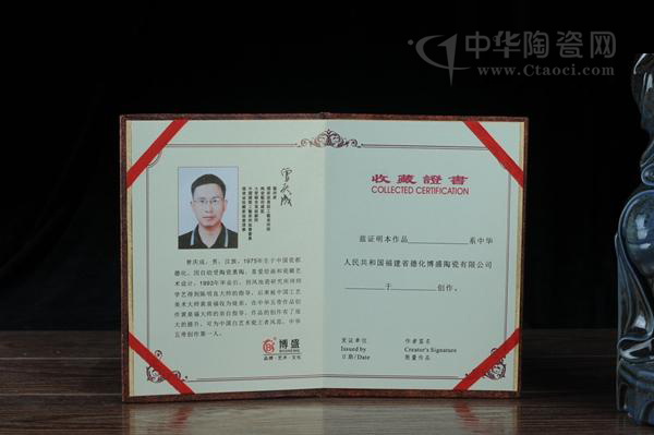 曾庆成,男,1975年8月出生于中国瓷都德化。毕业于景德镇陶瓷学院雕塑艺术设计。学历:大专,中国陶瓷艺术名家、福建省工艺美术师,1993年到凤池陶瓷研究所拜师学艺,经陈明良大师细心指导,雕塑技艺得到很大提升。后又被中国工艺美术大师黄泉福收为徒弟。经不断刻苦学习,潜心研究瓷塑艺术与创作,短短数年,取得了不少的成果。2011年创办了《德化县博盛礼品有限公司》。现为中国陶瓷艺术大师,高级工艺美术大师,中国国际工艺美术协会会员,福建省古玩商会理事,2014大爱归来公益活动组委会高级顾问,中国白艺术瓷王者风范、中华五帝作品创作第一人。多件作品被省、市博物馆收藏,个别作品在国内外展览中荣获金、银、最具收藏价值奖等荣誉。