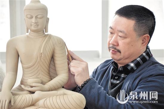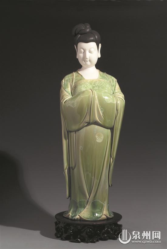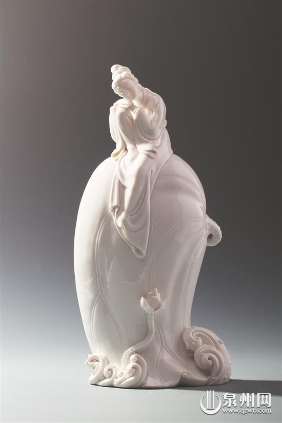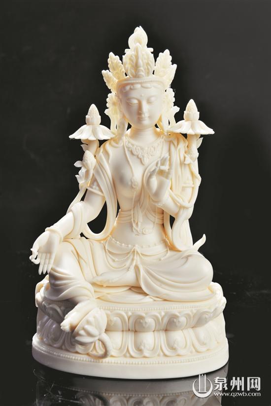 我们平时所见藏传佛像多为铜像,但在林建胜的“聚玉堂”艺术馆内,记者见到的如《长寿佛》《绿度母》等藏传佛教造像作品,则是用德化白瓷来表现。林建胜说,这些年他在研习藏传佛教,也在创作这方面的作品。为做好作品,他专门去西藏等地感受风土人情,学习当地文化。他说,只有不断学习、亲身体验,作品才更真实,才更有灵性。