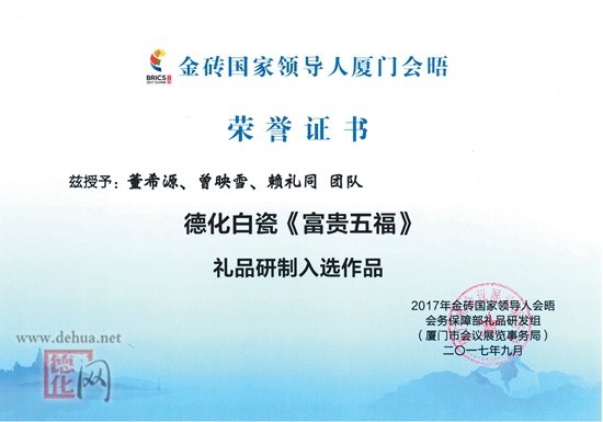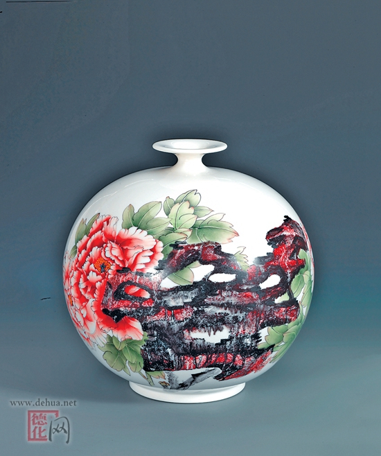“牡丹是中国的国花,有富贵吉祥的美好寓意。”谈起创作国礼《富贵五福》的构思,曾映雪说,整件作品以球体为主体,利用陶瓷瓶天方地圆的造型,使用五朵“不分彼此,不分大小”的牡丹花环绕球瓶一周,让人站在任何一个角度看,都是一个完整的画面,象征“和谐共融,互惠互利”。值得一提的是,这件在装饰手法上首创釉上高温装饰,是一次创新和突破,也是国礼中唯一一件陶瓷绘画作品。