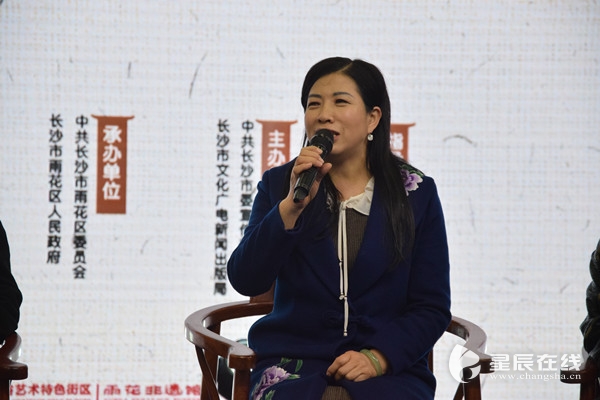 第一个主题对话环节是匠人间的交流互鉴对话。其中,湘绣国家级代表性传承人江再红介绍,对于湘绣与陶瓷的碰撞,她早在2014年就结合青花瓷创作了湘绣服装和挂屏,市场反馈非常好,尝到了湘绣跨界的甜头。“还有更多的中国的统技艺可以融合进湘绣,传统的元素新的做法,一定会得到认可。”