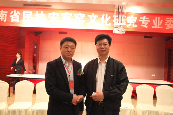 河南省民协宋官窑文化研究专业委员会主任、开封市重和宋官窑文化有限公司总经理张卫东(左)与河南省文联副主席、河南省民协主席程建君(右)