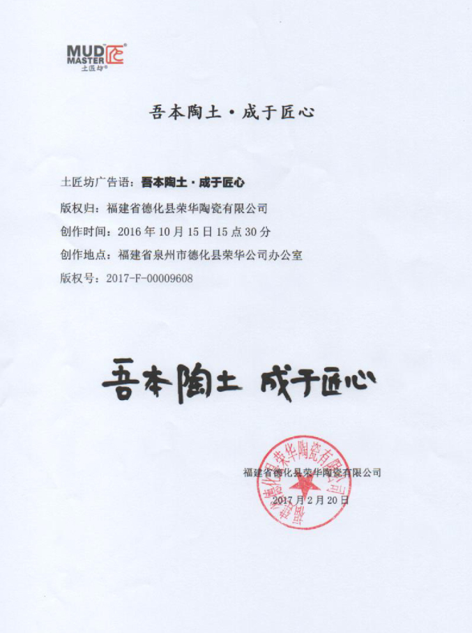 土匠坊广告语:吾本陶土·成于匠心 版权归:福建省德化县荣华陶瓷有限公司 创作时间:2016年10月15日15点30分 创作地点:福建省泉州市德化县荣华公司办公室 版权号:2017-F-00009608