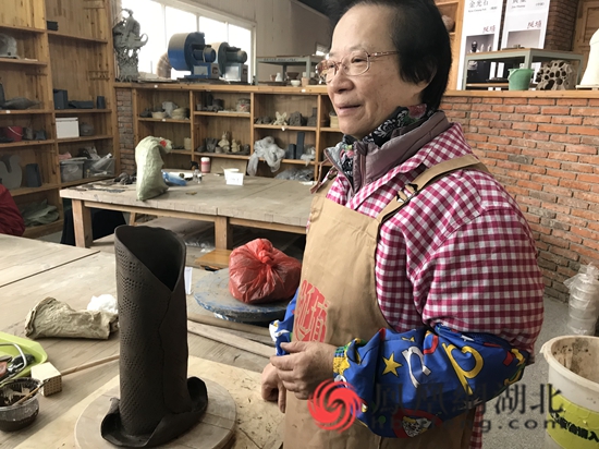 何老清晨到达陶艺馆后一直在工作台前制陶,摞泥、拉坯,有条不紊,与一旁的韩国陶艺家金相基还不时交流几句,“韩国的制陶工艺跟我们还是有区别的,陶土也不一样,希望他们有时间能去我们官窑镇看看楚陶的技艺。”