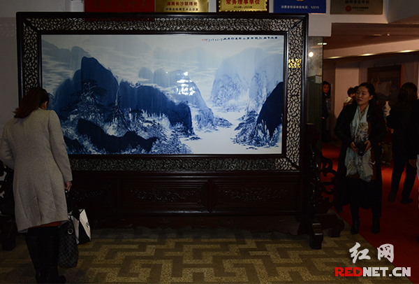 展出的泼墨釉下青花山水《碧水乍开镜面青山都是好屏风》,是张长钧经过近万余次研究创作成功的陶瓷艺术精品。