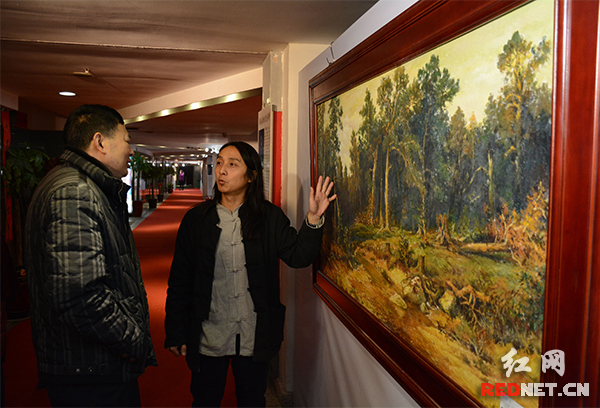 中国景德镇国家一级陶瓷工艺美术师张长钧(右)向艺术爱好者讲述陶瓷油画作品。