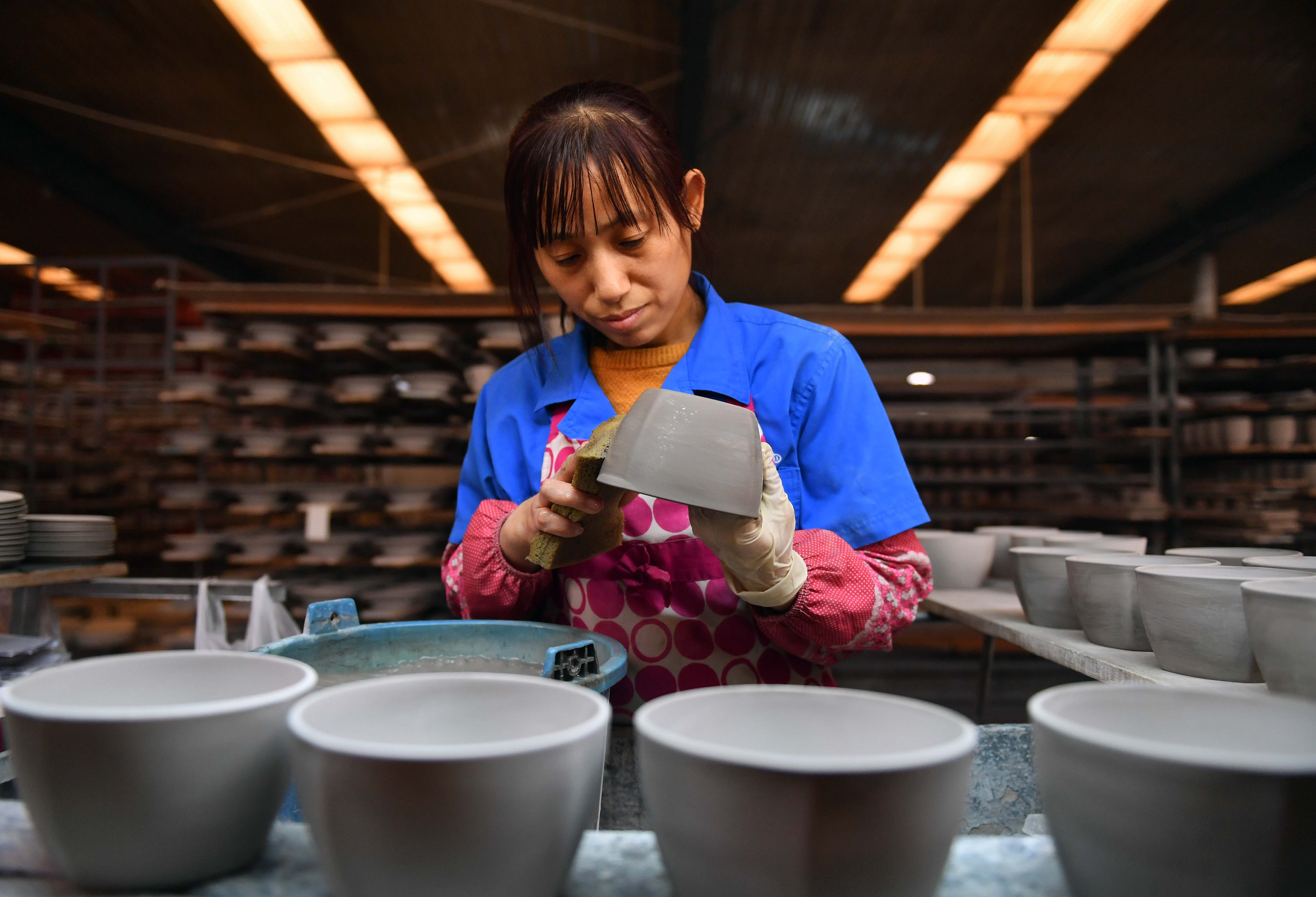 山东海瓷集团工人在修整瓷器胚胎(11月28日摄)。