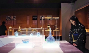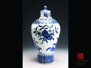据策展人朱铁权介绍,粤博馆藏明清青花瓷器数量众多,珍贵文物达千余件,器型多样,纹饰精美。本次精选160余件(套),从三个层面进行展示。在“文化瓷韵”板块,通过纹饰、器型等展示明清青花瓷器特有的文化韵味。“明嘉靖款青花寿字葫芦瓶”很有代表性,束腰葫芦形,腹部主题纹饰为梅、竹、仙鹤、鹿及双寿字等。据介绍,嘉靖官窑青花使用的是“回青”青料,蓝中带紫,浓重艳丽。