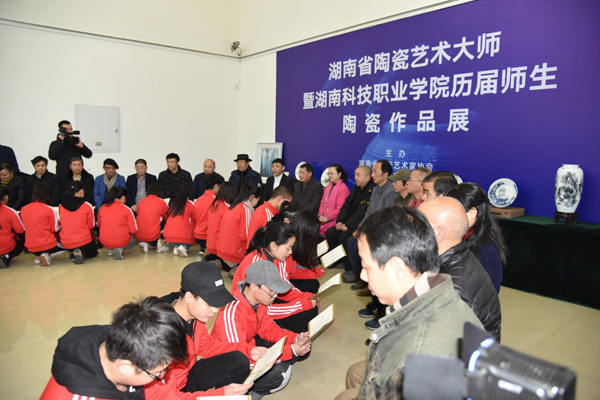 拜师仪式上,邓江晨和同学们向大师们敬茶,还宣读了“拜师贴”,承诺将“谨遵师教,刻苦钻研,弘扬湘瓷文化,传承匠心精神”。