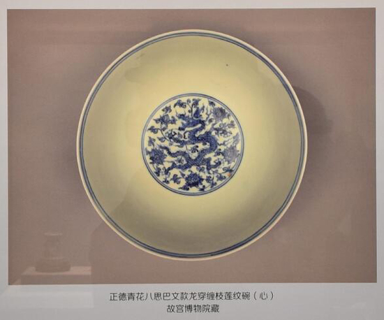 该部分展柜背景图所展示的正德青花八思巴文款龙穿缠枝莲纹碗(心)图