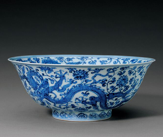 此碗沿用明代前期龙穿缠枝莲纹碗的造型和纹饰,双钩纹饰线条流畅,填色细致,青花发色纯正,局部出现铁锈斑,体现出正德朝御用青花瓷器造型稳重、纹饰精美的风貌。