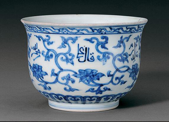 以阿拉伯文作为瓷器装饰以明代正德朝御窑瓷器上最为多见,除缠枝莲托阿拉伯文外,另见有在圆形或菱形开光内书写阿拉伯文者,文字内容多位《古兰经》里的语录。