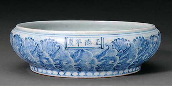 正德御窑青花瓷器造型比成化、弘治朝御窑青花瓷器丰富得多,因应社会需求而烧造的书房、客厅用器和寺庙用供器明显增多。所绘图案以龙、缠枝花卉、阿拉伯文、波斯文为主。所署年款既有青花楷体 “大明正德年制”六字款,也有“正德年制”四字款和“大明宣德年制”仿款,更有稀见的八思巴文款。