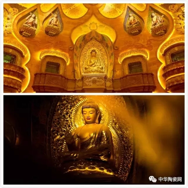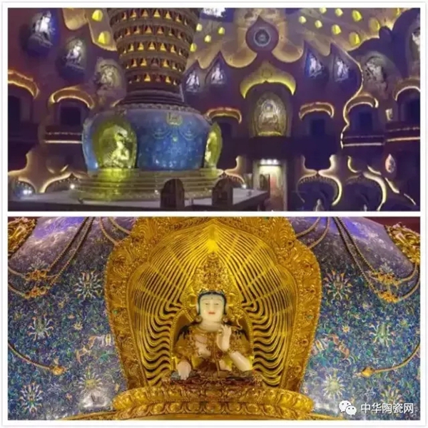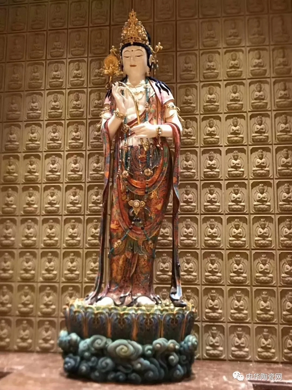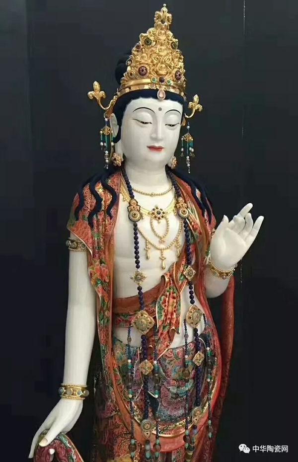 烧制完成之后,还要由莆田工艺大师吴立波进行彩绘和镶嵌,包括表面岩彩金线镶嵌,璎珞、莲台、背光局部岩彩镶嵌等。
