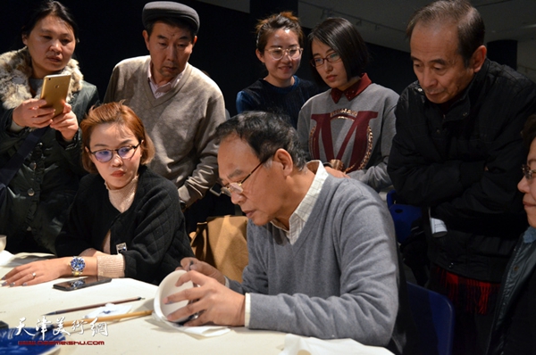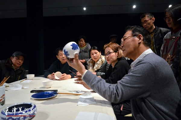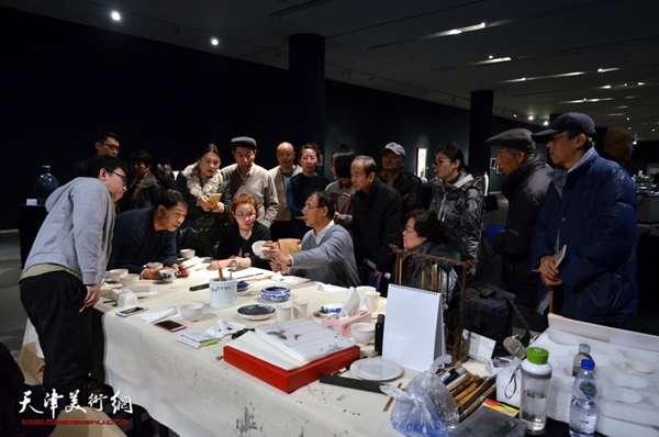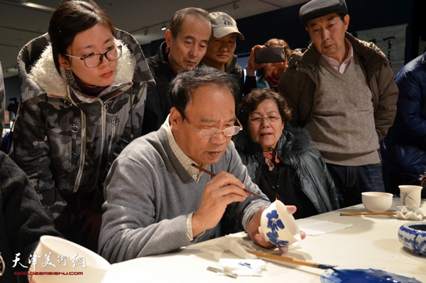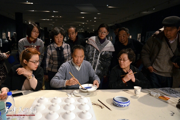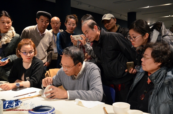 天津美术网讯 昨天(12月17日),著名画家马寒松来到正在天津美术馆展出的“天之瓷—天瓷画院庆祝党的十九大胜利召开”陶瓷艺术展现场,与陶瓷艺术爱好者互动,并现场演示陶瓷艺术创作过程。