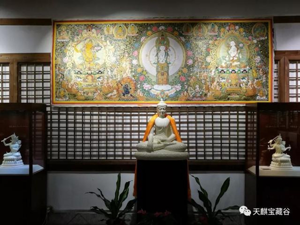 这次展出的作品有“宝藏谷”藏传佛瓷造像、勉唐画派唐卡作品。“宝藏谷”藏传瓷质造像是依据藏传佛教《造像度量经》的仪轨进行严格演算和雕塑,经过火的烧制,显得细腻精美,温润通透,呈现出庄严、肃穆的艺术效果。