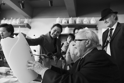 据悉,洞上陶艺村改制于原三班镇蔡径村办瓷厂,自2013年11月成立陶艺村以来,已吸引各地30多名艺术家成立创意工作室23家、陶艺DIY体验区4处,年接待游客近8万人次。图为德国友人在陶瓷坯体上签名。
