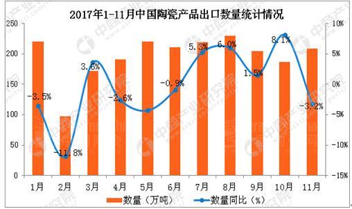 据中商产业研究院发布的《2017-2022年中国陶瓷产品行业市场前景及投资机会分析报告》数据统计统计显示:2017年11月中国出口陶瓷产品209万吨,同比下滑3.2%;1-11月中国出口陶瓷产品出口2151万吨,与去年同期相比增长2%。