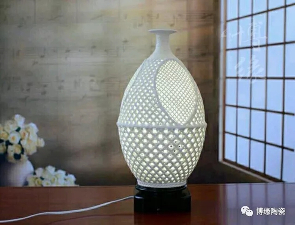 编织镂空的花瓶其特点就是薄壁亮透,镂空花纹多样,在瓷器胎体上通过纯手工编织及镂雕工艺,选用高档瓷制作,胎质如玉,展现的风格是:高贵典雅的欧式家居风格。
