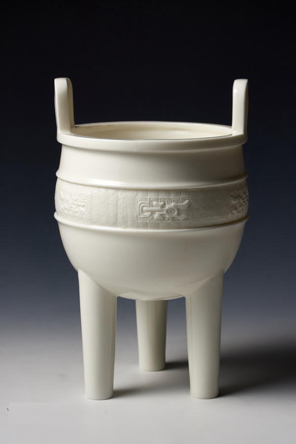 复制的白釉夔龙纹双耳三足鼎