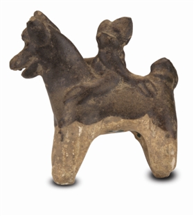 图1所示为宋褐釉童子骑狗瓷塑,长6厘米,宽3.4厘米,高6.1厘米;器身为褐色,四足露胎无釉,狗背上童子造型夸张,头戴尖顶帽子,浅刻双目,五指尖长刻画清晰。右手在前,左手在后,身体挺直,作骑马状。狗头稍偏左侧,双目深陷,嘴张开,狗尾呈盘旋状翘起。一幅憨态可掬的童子骑狗图跃然纸上,让人流连往返。