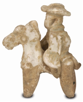 图2为宋白釉老翁骑马瓷塑,长3.8厘米,宽2厘米,高4.2厘米。马四足露胎无釉,马头部夸张,马上坐一老翁,头戴斗笠,双目深陷,身着宽袖衣衫,手五指呈伸展状且刻画清晰,右手在前放于马颈,左手下垂放在马腰上。双腿夹紧马肚,扭身躬背做骑马状。马双目圆睁,大耳直立,长嘴微合,似作呼呼喘息状,马尾较短。