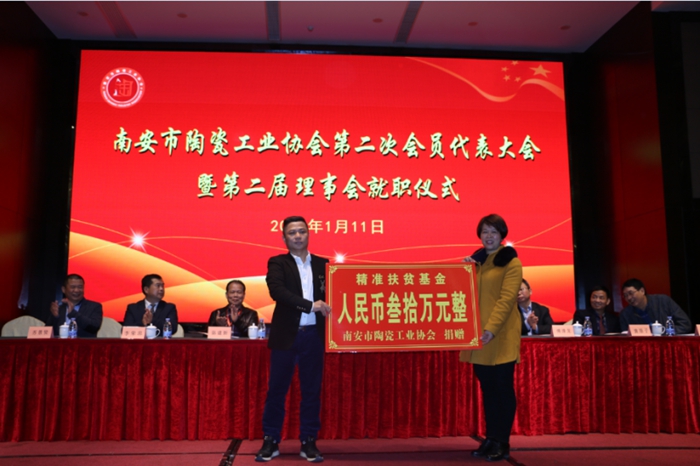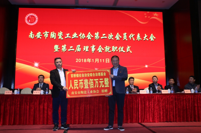 会议期间,南安市陶瓷工业协会向官桥镇社会治安综合治理基金会捐赠100万元、向“万贤扶千户” 精准扶贫行动捐赠30万元。充分体现出回报社会的企业家精神。