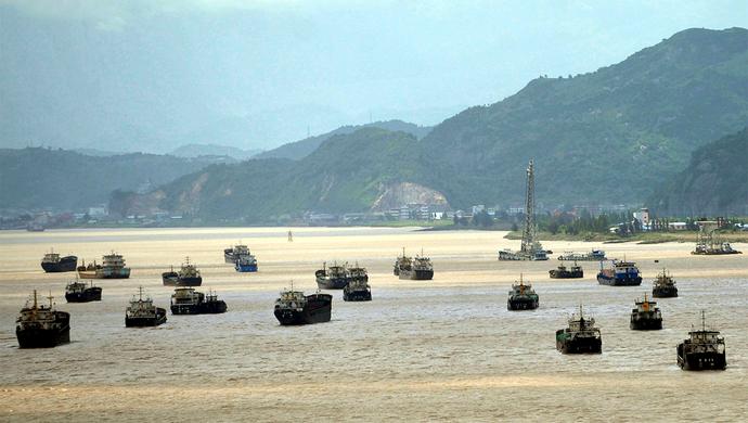 33016号中国渔政船停泊在安澜码头,升火待发。这是一艘300吨级渔政船,续航能力强。我们随船员先后上船,这也是我首次搭乘轮船进行没有固定航道的航行,内心颇感新奇。8时整,渔政船鸣笛三声启碇航行,缓缓驶向瓯江口。船出瓯江口,海水渐渐变清变蓝。渔政船提速,船尾犁出一道呈开放形的白色水道……
