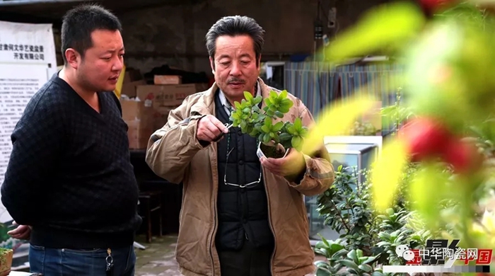 图为何文华为何青瀚讲解艺瓷盆景知识。