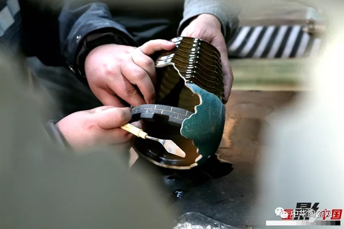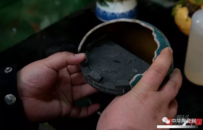 为了解决因瓶口小、透气差,艺瓷工艺盆景植物易干枯腐烂的弊端,何文华对艺瓷容器进行了改良,将底部用水锈石进行粘合替换,解决了其吸水、渗水差的问题。2014年,他创新的“一种水锈石结构的花盆”成果获得了国家知识产权局颁发的实用新型专利证书。2016年,何文华被甘肃省轻工业联合会授予“工艺美术大师”荣誉称号。图为何文华正在修整一件瓷盘盆景。