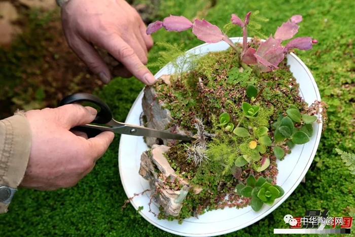图为何文华演示艺瓷盆景的重要环节——修枝。