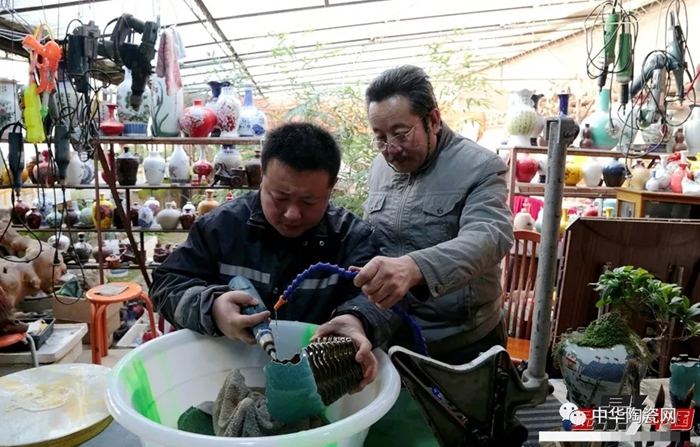 图为何文华和何青瀚父子俩正在制作艺瓷盆景。