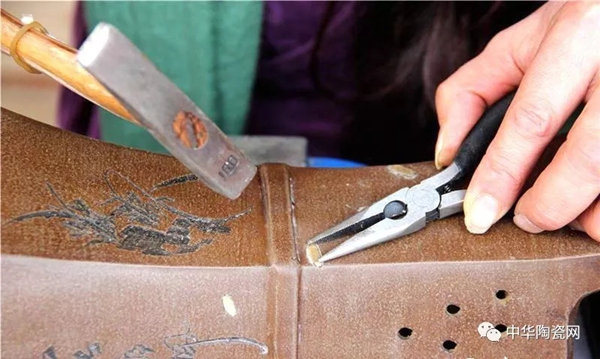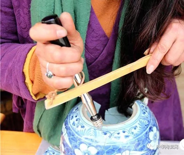 锔瓷,是中国的一门古老技艺。锔瓷工艺就是以金刚钻为针,以锔钉为线,把打碎的瓷器,用铜、铁等金属“锔子”钉起来,使之得以修复并重新使用的技术。
