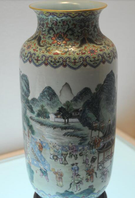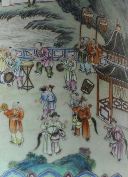 瓶身似圆形长灯笼,外壁用粉彩绘有庭院婴戏图,远处山峦起伏,近处有小桥、流水、亭台、古松,三十个衣着艳丽的童子或手持福字灯,或燃放鞭炮,或敲锣打鼓,在庭院中嬉戏玩耍。
