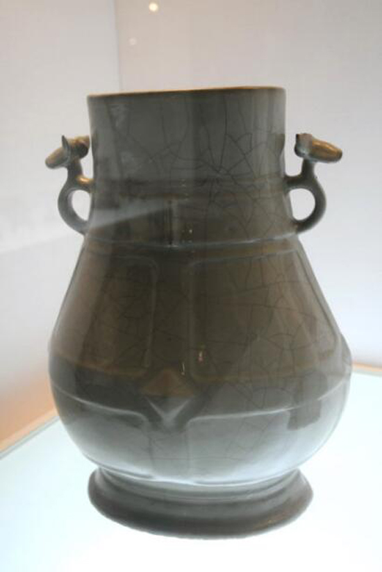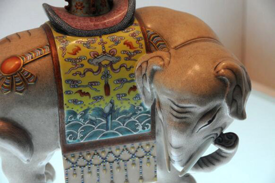 象作回首状,施米灰色釉,棕毛毕现,元宝形鞍上驮有葫芦形珐琅宝瓶。这是宫廷中常见的陈设器,象是太平盛世的象征,象驮宝瓶喻意“太平有象”。