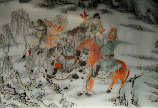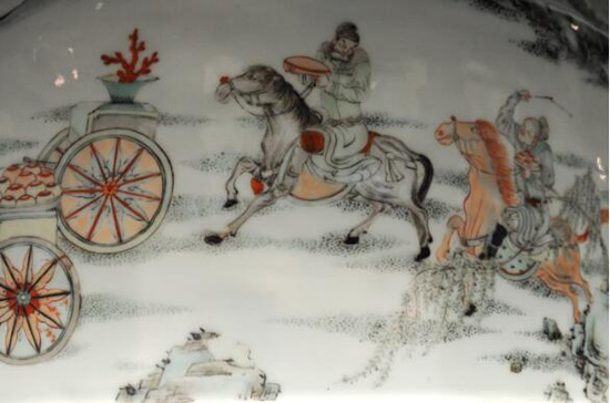 一位驭手前引着马、鹿相套的满载珊瑚等珍奇异宝的两轮车,八骑异国使者手捧贡品,穿林越壑而来。这种纹饰是瓷画的传统纹样。