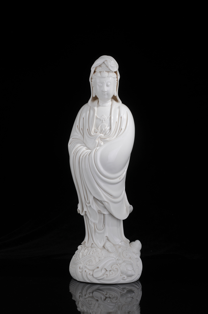 简介:该《渡海观音》由中国青年陶瓷艺术家设计制作,以德化特有的温润如玉的“中国白”为胎质,纯手工制作,作品圆劲有力如凝脂似玉,滋润莹滑,神情娴雅平静,安详自若,双目低垂凝思,衣纹线条清晰、简洁、潇洒,多变化,柔媚流畅,翻转自然,观音双手藏袖,露一足踏莲花,另一足水花掩盖,作踏浪凌波渡海之势刻画的栩栩如生。经高温1300多度烧制,整尊造像美伦美焕,活灵活现,是一件上乘之品。