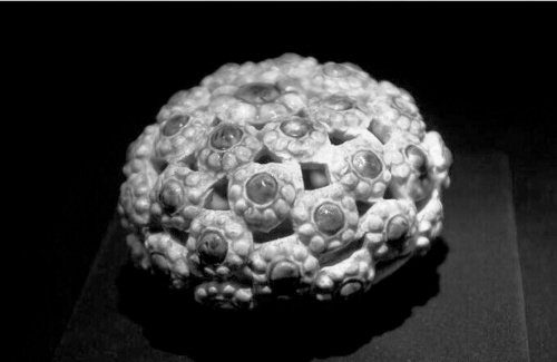 三彩香薰 高8.7厘米,熏香用具,形制源于唐代金银器——香球,其内放置香料,点燃后香气袅袅,养神怡心。此香薰造型别致,镂空与贴塑完美结合,工艺精湛,体现了契丹贵族对唐宋生活方式的向往与仿效。