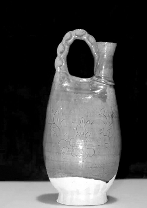 白釉刻花皮囊壶 宽16厘米,高28厘米。此壶鼓腹呈圆形,短流,卷沿,圈足,肩上有穿绳孔。通体施白釉,壶身两面刻花叶纹。皮囊壶又称马镫壶,因其形似马镫而得名,是辽代契丹族特有的生活用具。