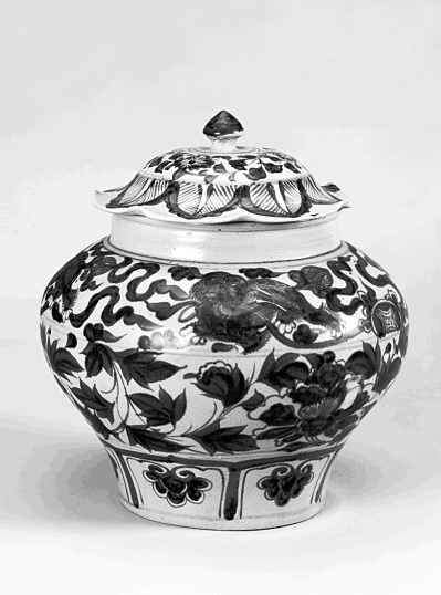 玉溪市博物馆藏玉溪窑青花狮子滚绣球纹盖罐(光明日报图片)