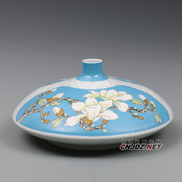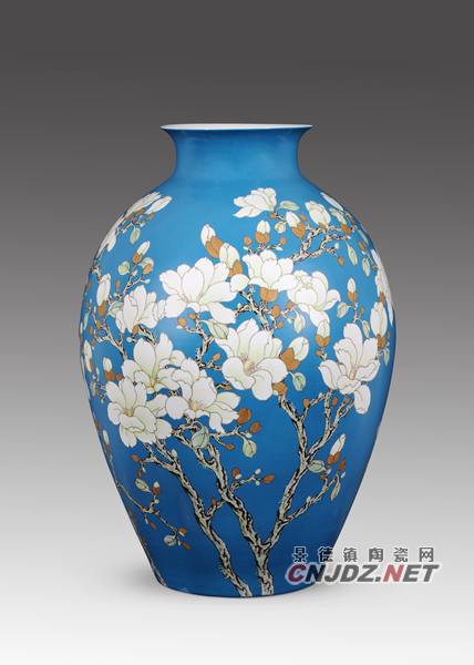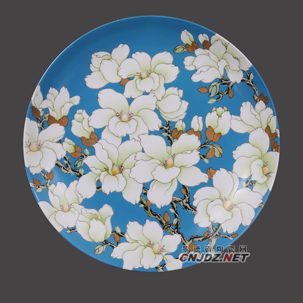 景德镇的陶瓷艺术家画花鸟的很多,其中,花卉里面画荷花、牡丹的居多,画白玉兰的很少。江西省高级工艺美术师、青年陶艺家周国生于2012年始创蓝釉地白玉兰梦系列陶瓷作品被申请专利,作品也广受好评。