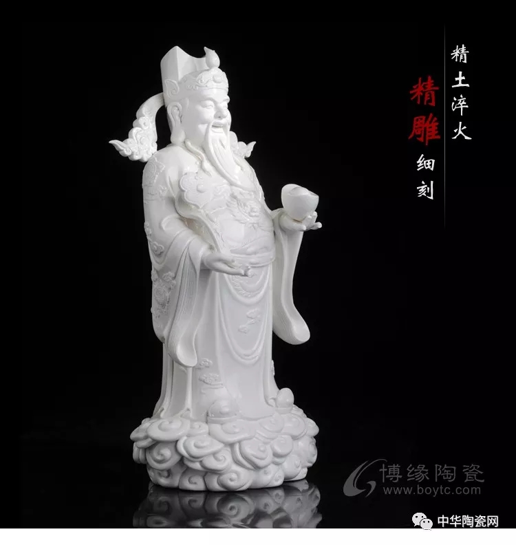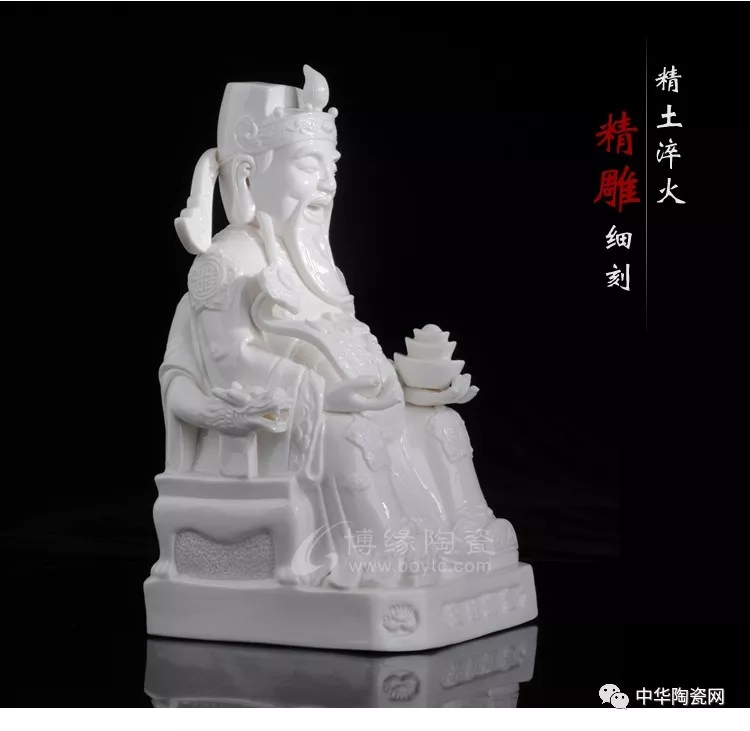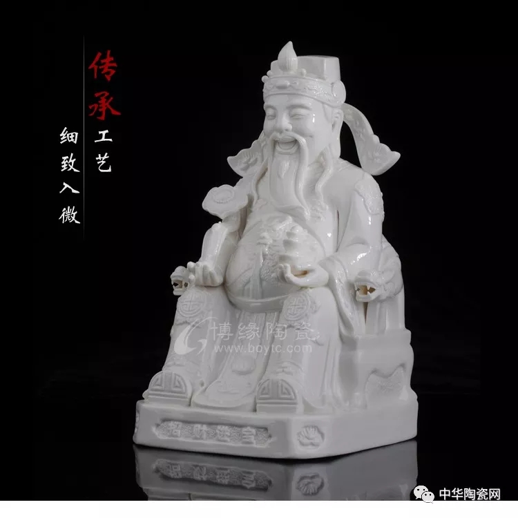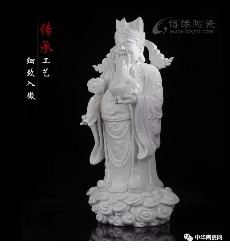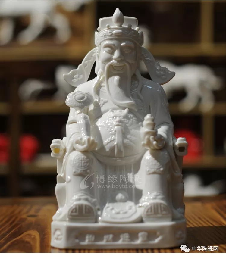 财神佛像是德化窑瓷塑艺术的常见题材之一。德化瓷塑在中国陶瓷史上久负盛名,它用优质的白瓷塑造神态各异的人物,以纯净莹润的釉色和生动传神的形象取胜,摒弃彩绘而追求单纯的雕塑美和原材料的质地美,独具艺术风韵。