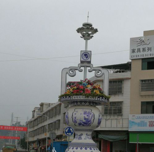 为推进品牌建设,该县统一标识,积极实施名标、名牌战略工程,通过政策扶持,引导和鼓励陶瓷企业制定产业联盟标准,统一使用“大埔陶瓷”商标。目前,已有第一批22家陶瓷企业申请使用“大埔青花瓷”地理标志产品专用标志。为更好地提高大埔青花瓷的知名度和美誉度,打造大埔陶瓷主产区形象标志,形成大埔青花瓷区域特色,推动大埔青花瓷品牌建设,大埔县日前在该县最早的陶瓷产地、被誉为“白玉城”的大埔陶瓷主产区高陂镇主要交通要道高陂中学门旁的十字路口圆盘,设立了大型青花瓷花篮(如右图)。该圆盘花篮高9.4米,圆最大直径4.5米,共分三层,第一层主要是以植被为主的绿化带,寓意春意盎然、百花齐放;第二层是以多个具有特色的青花瓷成品(玻璃钢替代品)簇立在花草之上,环绕中心,向人们展示不同种类、风格的青花瓷;第三层则是花篮,傲立中心,充分展示出青花瓷赏心悦目、淡雅脱俗的特点。