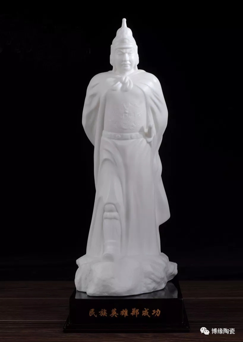 《民族英雄郑成功》——作品以闻名世界的德化白瓷为胎质,由工艺美术大师制作,精选优质高岭土,经70多道工序手工制作而成,作品经过1300多度高温烧制,瓷质温润、细腻、人物精雕细刻,所塑郑成功神形兼备,气势磅礴,再现了当年郑成功挥师东渡,驱荷复台的历史场面。作品全高39cm。