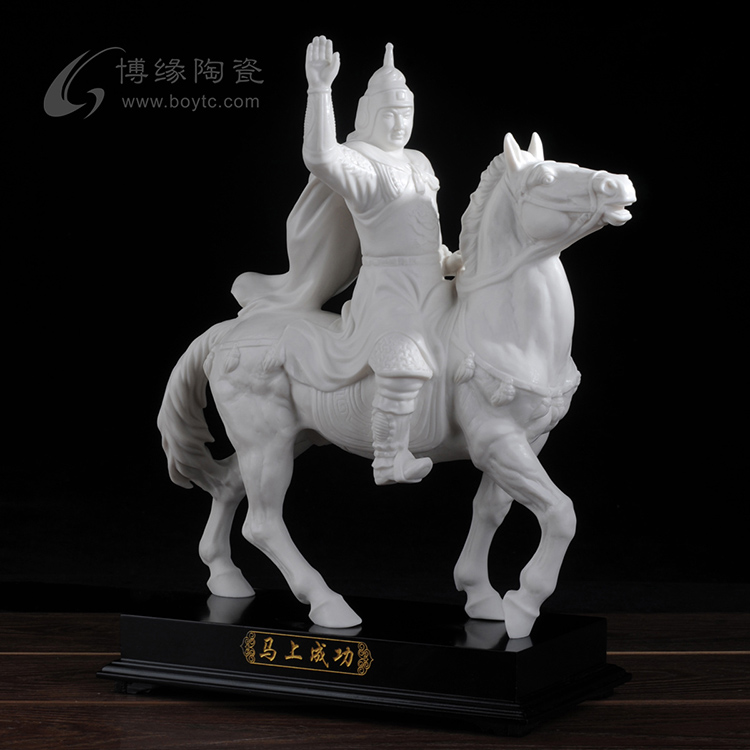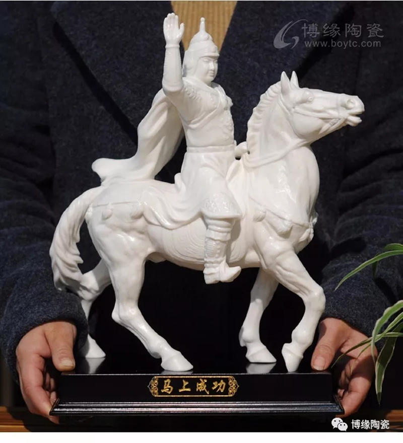 《马上成功》作品由德化工艺美术大师制作,以德化特有温润如玉的“中国白”为胎质,手工制作,所塑人物威风凛凛,英姿飒爽,形神兼备;所塑骏马健硕勇猛,栩栩如生,尤如马蹄声阵阵,银蛇腾空去,烈马飞奔来。